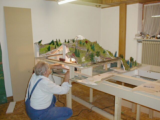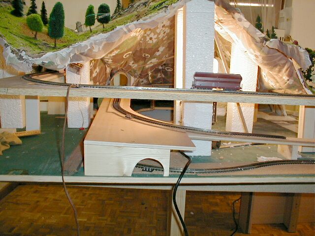 Das Originalteil hat noch eine weiße Bergspitze, die später übermalt wurde. Unser Handwerker vervollständigt die Strecke im Inneren. Von der offenen Seite sieht man die recht abenteuerliche Konstruktion aus Styropor, bunten Bettlaken und Gips auf Resten einer Tischtennisplatte.