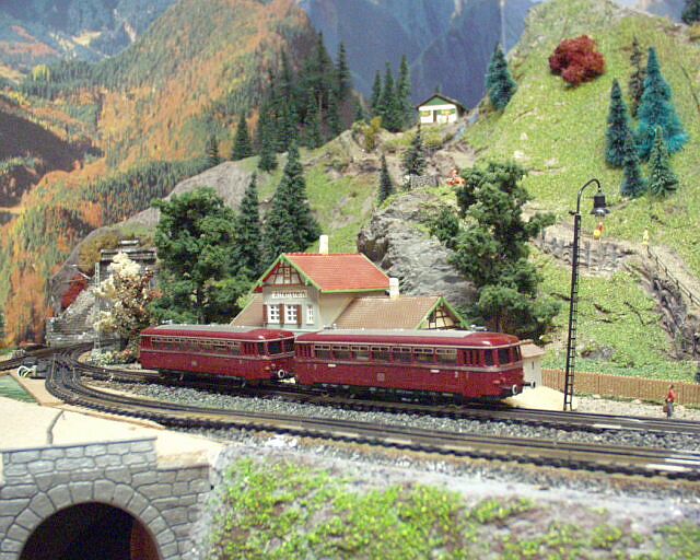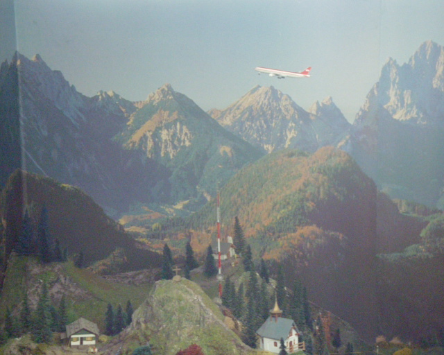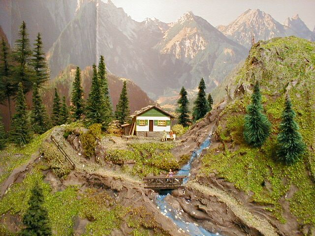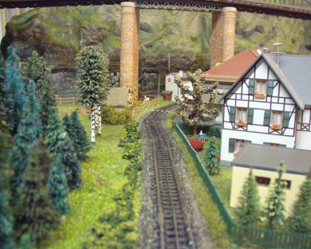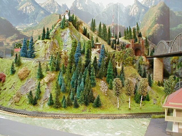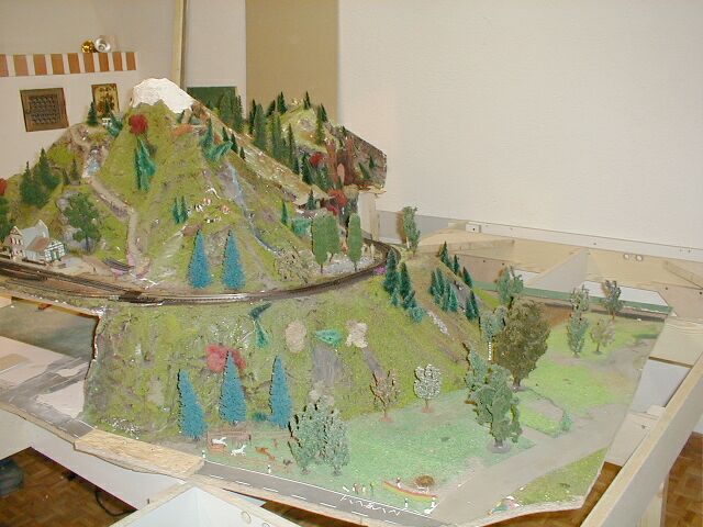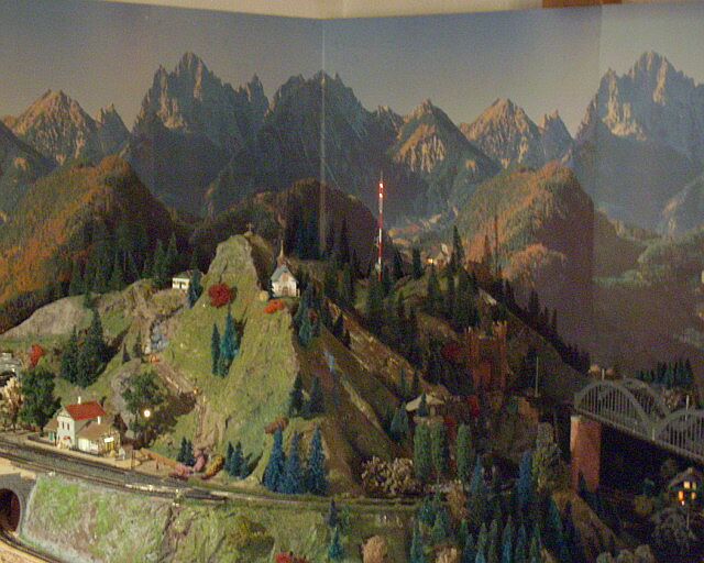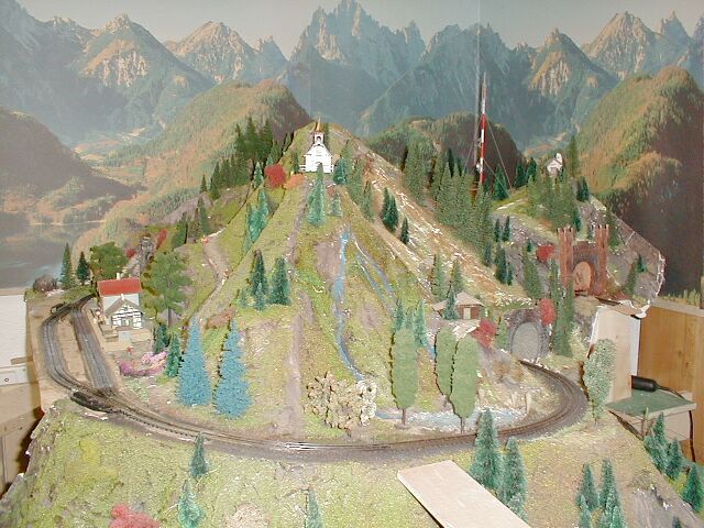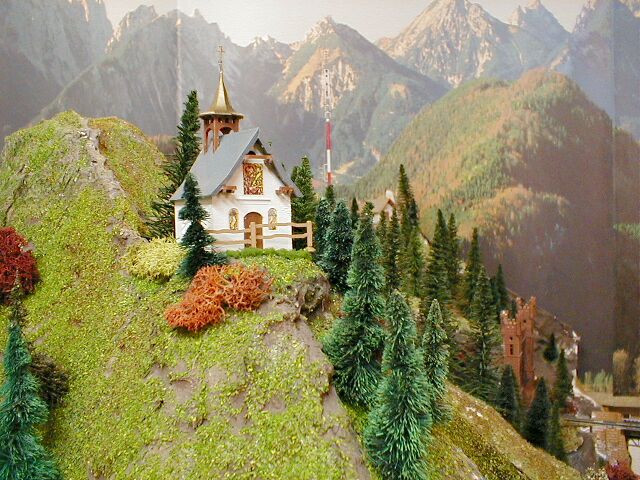 Das Teil steht an seinem endgültigen Platz in der Zimmerecke, mit schönem Hintergrund. Der Funkmast ist wieder da, die kleine Kapelle und ein paar Bäume kamen neu dazu.