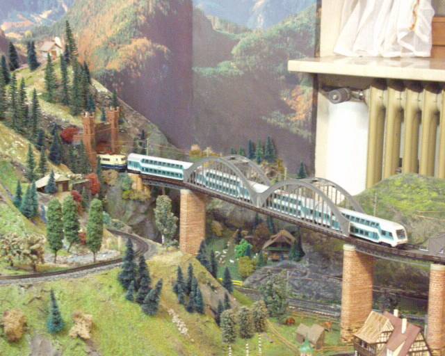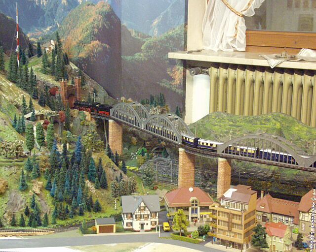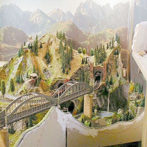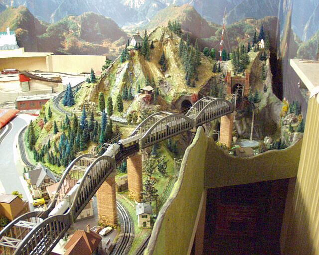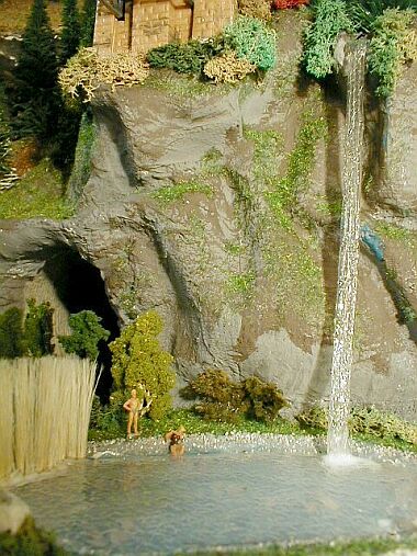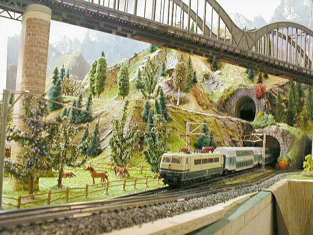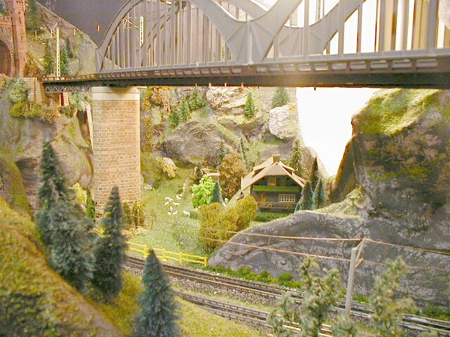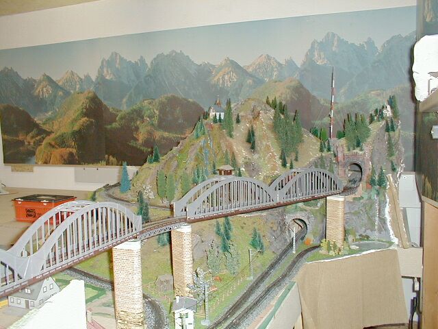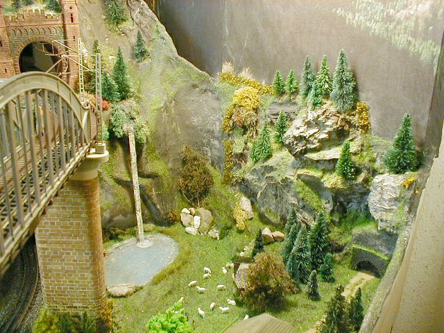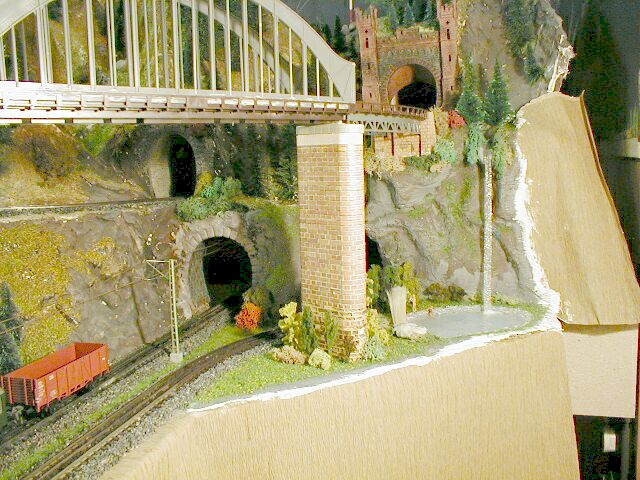 Eine lange Brücke oben und Gleise unten verbinden nun die Bergteile der Anlage. Der erste Zug passiert eine Pferdekoppel unter der Brücke. Die offene "Wunde" unter dem rechten Tunnel wurde geschlossen und darunter wurden die ersten Versuche mit "Wasser" gemacht, wobei ein Wasserfall und ein kleiner See entstand.