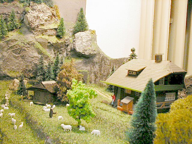 Eine Rückwand schließt das Eck endültig ab. Fast alle Gleise haben Oberleitungen bekommen. Im Eck entstand ein kleines Idyll mit einer Hütte und Schafen.