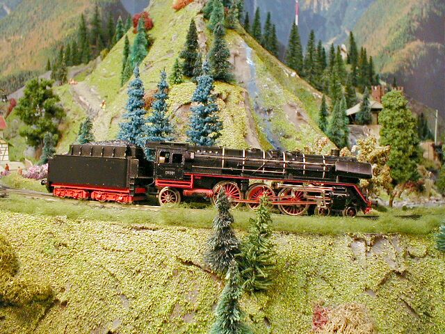 Der Berg wurde im unteren Teil noch ein wenig aufgeforstet. Dazu eine schöne Lok vor der Bergkulisse.